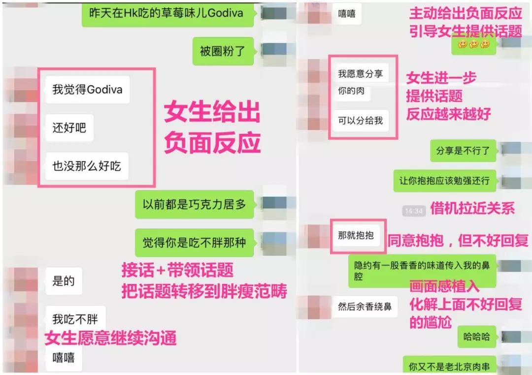 所以,我们采取了四两拨千斤的方法——“接话+带领”,把话题带领到胖瘦范畴,瞬间让女生感兴趣,后续成功的升级了关系。