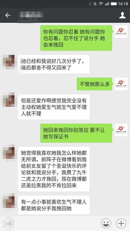 男孩挽回女孩,分分合合一年多,女孩不同意不拒绝,让学员很烦,我感觉他这样不行,必须给女孩施加一些压力,正好他们单位和一个女性职员偏多的单位搞联谊,我就让他去见见有没有好的,换换心情,天天闷着人也受不了不是。听指导就去了,去了之后还真感觉一女孩挺好,巧的是那女孩也看上了我们这学员,一来二去聊得挺好。